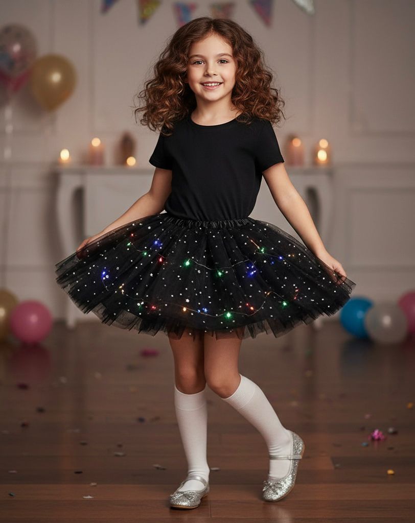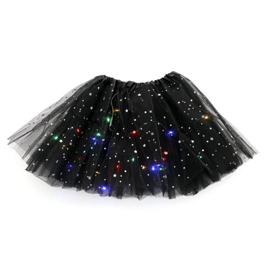 Transformă orice moment într-o poveste de basm cu această fustiță tutu neagră cu luminițe LED, creată pentru micile prințese care adoră să strălucească. Realizată din straturi fine de tulle delicat, decorată cu steluțe discrete și luminițe colorate integrate, fustița oferă un efect spectaculos atât ziua, cât și seara.